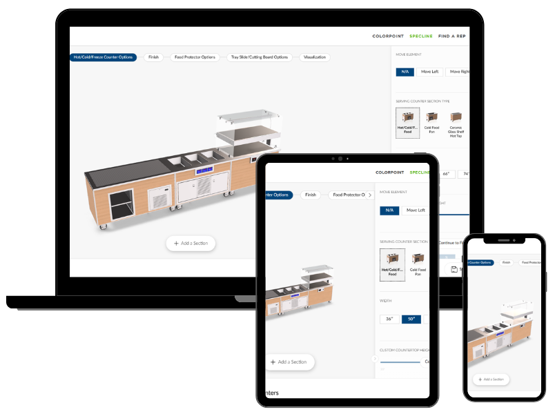 LTI’s product Configurator is an innovative tool that gives you the ability to design ColorPoint and SpecLine serving counters. The Configurator empowers you to bring your vision for a serving area to life with ease and flexibility. Whether you’re designing for a cafeteria, hospitality venue, or commercial kitchen, this tool streamlines the process from concept to visualization. You can choose from base materials such as molded fiberglass, laminated or stainless-steel finishes, and select from assorted sizes and layouts. Mix and match finishes to complement your brand or interior design.