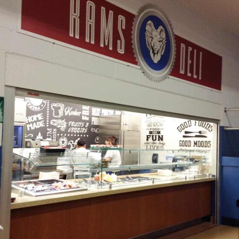 Convert an underused storeroom or an old dish room and its pass-through window into a separate serving area with a unique theme and offerings, like this New York-deli styled serving area, which led to significant increases in participation.